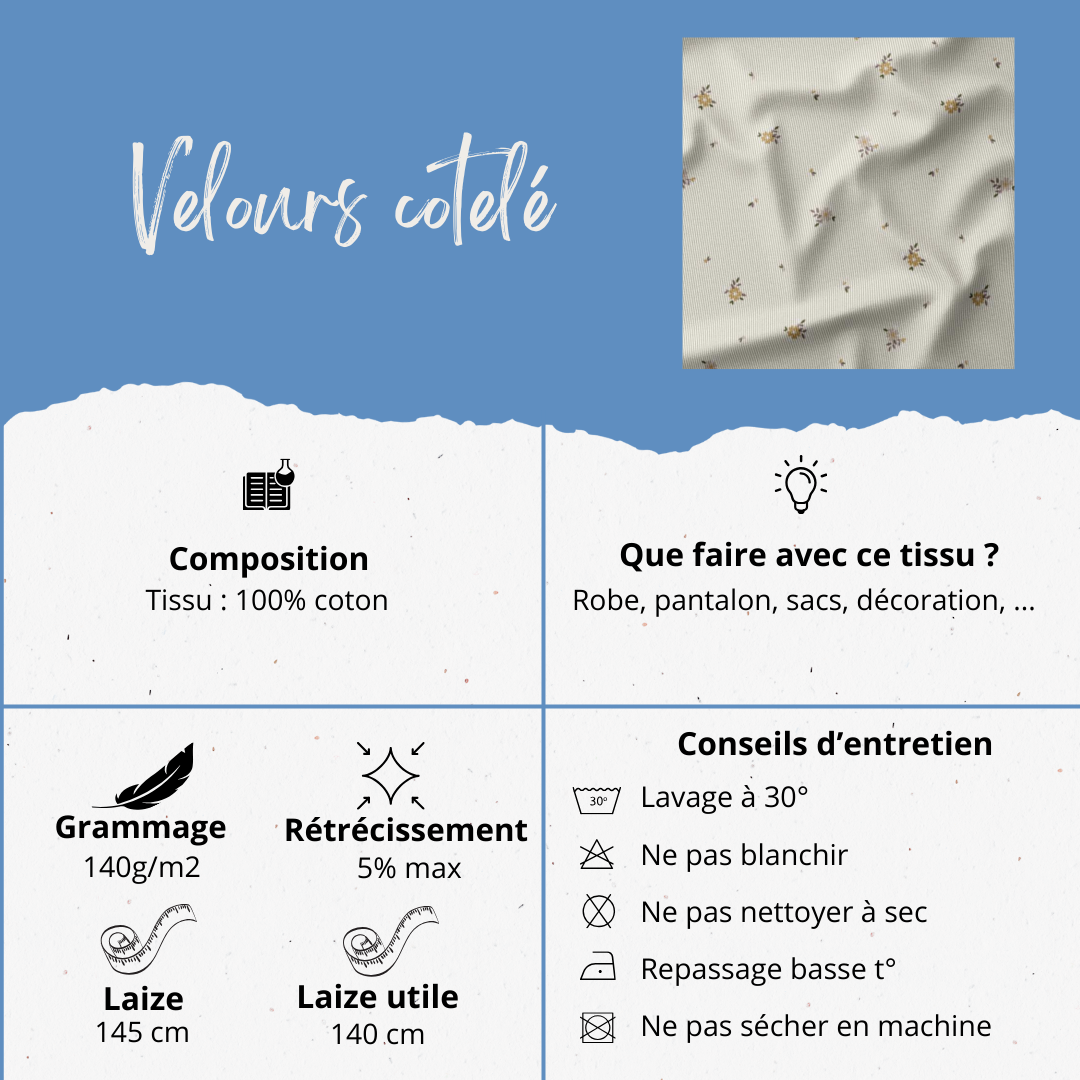 Que ce soit pour confectionner des vêtements (pantalon, robe, ...), des accessoires (sacs à main, sac à langer, ...) ou même des éléments de décoration, notre tissu offre à la fois douceur et durabilité.